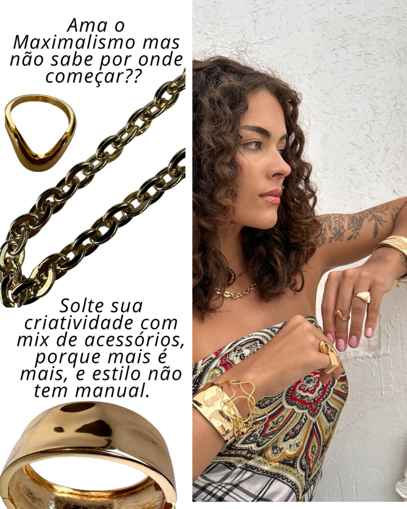 Se você adora a ideia de looks cheios de personalidade, cores vibrantes e acessórios que chamam atenção, o maximalismo pode ser o seu estilo! Mas, se a dúvida é como incorporar essa tendência sem exageros, comece aos poucos: aposte em peças statement, como brincos oversized ou anéis chamativos, e vá misturando texturas e estampas em camadas. Uma dica valiosa é escolher uma peça protagonista – como um colar marcante ou um pulseira bordada – e equilibrar o restante do visual com cores complementares. O maximalismo é sobre liberdade e autoexpressão, então não tenha medo de ousar e deixar sua criatividade brilhar.