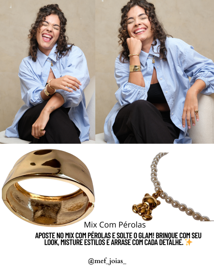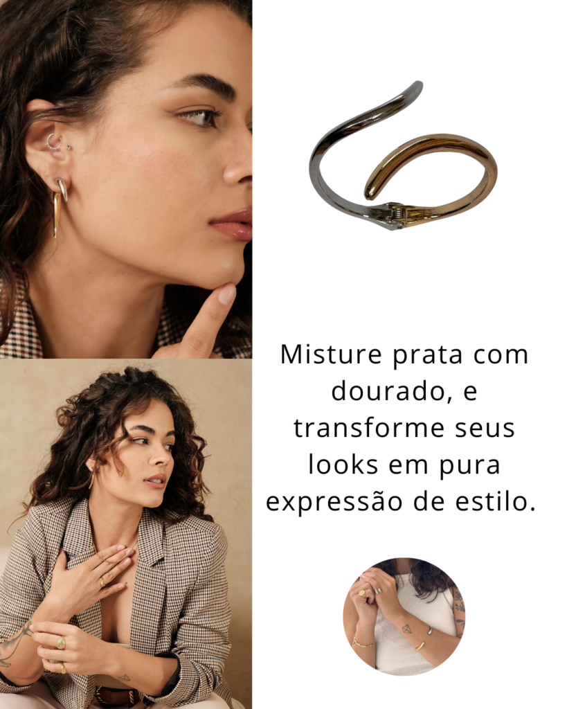 Quebrar a "regra" de não misturar metais já virou tendência, e o resultado é um visual cheio de personalidade! Combinar prata e dourado pode parecer desafiador, mas a chave está no equilíbrio: comece com uma peça protagonista, como um colar dourado, e acrescente detalhes em prata – como uma pulseira ou anel – para criar contraste. Outra dica é usar semijoias que já unem os dois metais em um mesmo design, facilitando a harmonização. O efeito? Um look intencional, moderno e cheio de estilo, perfeito para quem ama ousar sem medo.