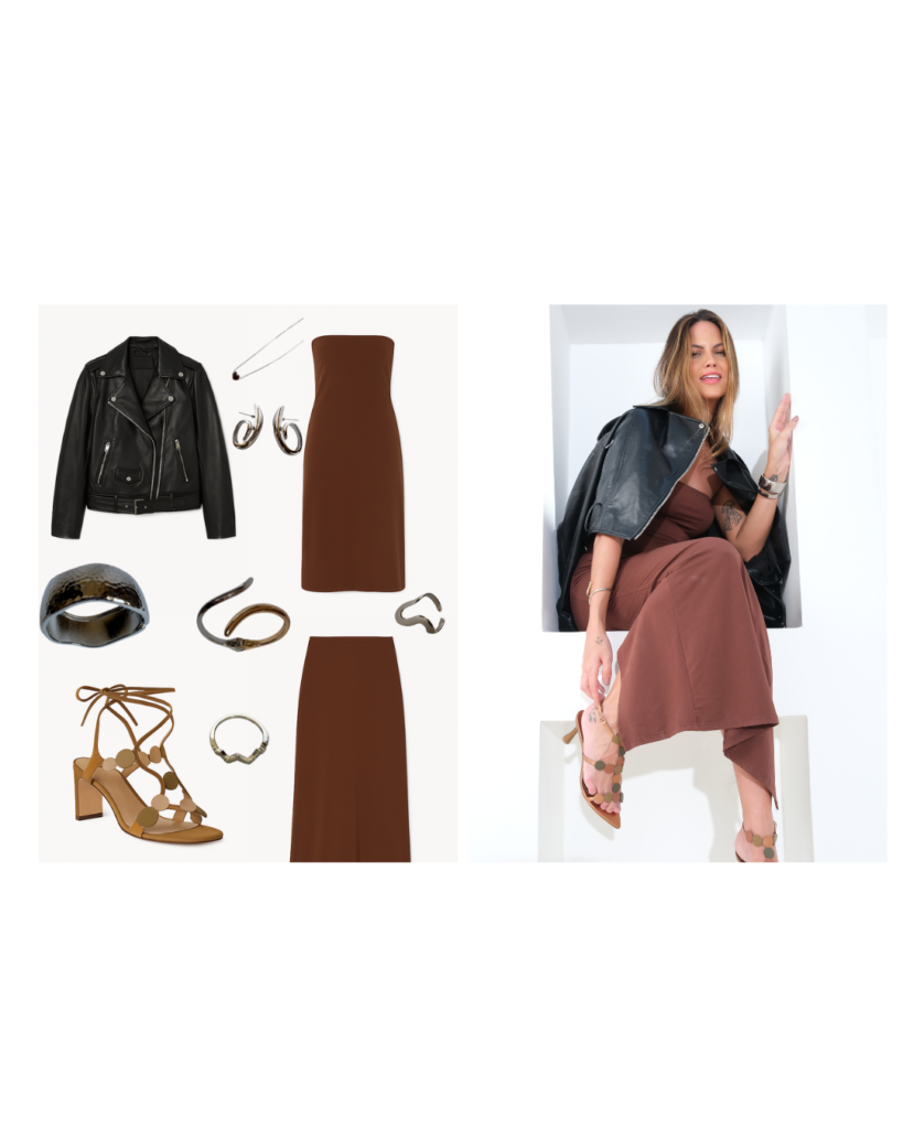 A jaqueta de couro – peça coringa que nunca sai de moda – ganha um ar ainda mais interessante quando combinada com um vestido fluido ou saia longa marrom, criando um contraste perfeito entre o rústico e o romântico. O segredo para equilibrar esse look cheio de atitude? Acessórios em ródio – um metal sofisticado e durável que eleva qualquer produção. Um colar minimalista, anel statement, brincos com detalhes geométricos e o mix de pulseiras (uma dupla e uma simples) são o toque final perfeito para quem quer brilhar sem medo. Ideal para um jantar especial, um evento noturno ou até para dar um up no visual do dia a dia!