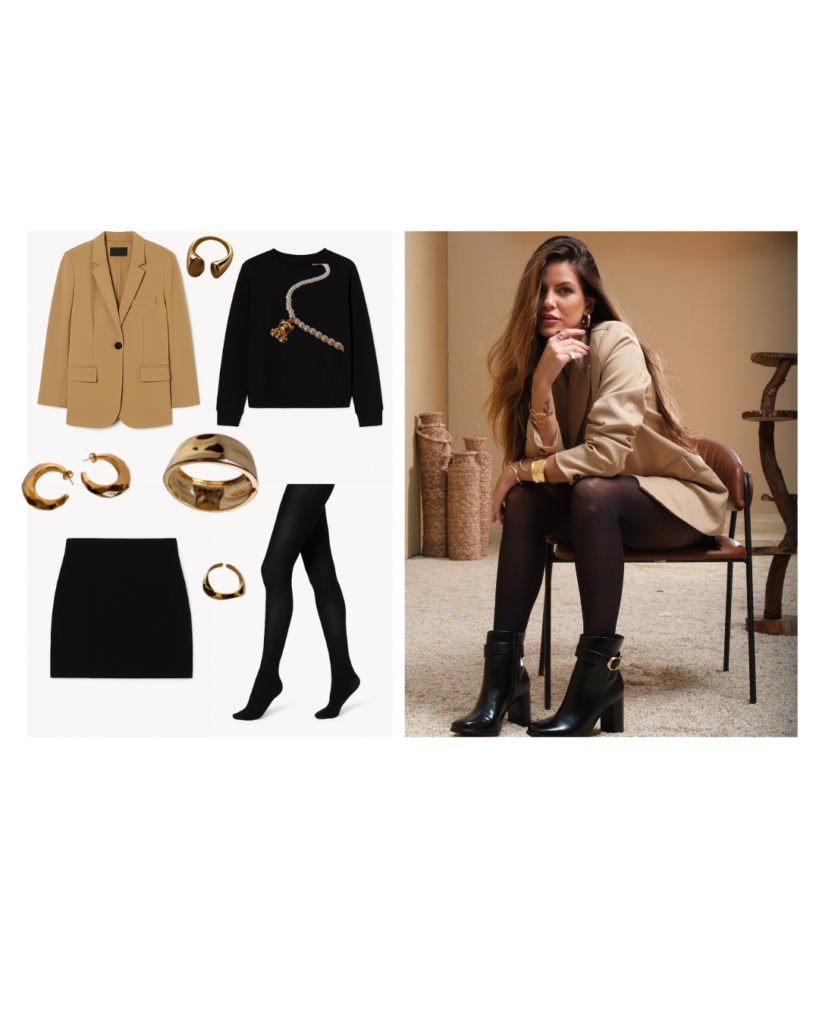 O clássico nunca sai de moda, mas é possível renová-lo com peças que trazem personalidade e atitude. Que tal apostar em uma camisa branca de botão combinada com um colete preto ajustado para um visual sofisticado? A saia preta curta de couro adiciona um toque de ousadia, enquanto a meia-calça com salto alto – tendência absoluta desta temporada – garante um contraste poderoso entre o clássico e o moderno. Para finalizar, concentre os acessórios em dourado: anéis e pulseiras (ou braceletes) dão um ar luxuoso, o brinco de argola traz movimento, e a bolsa preta mantém o equilíbrio do look. Perfeito para um jantar elegante, um evento pós-expediente ou até mesmo para arrasar no dia a dia com um toque extra de confiança!