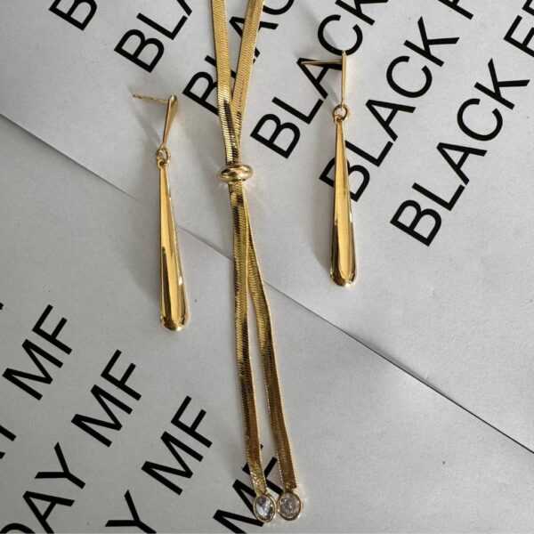 O colar estilo gravata alonga o colo com delicadeza, enquanto o brinco pendurado completa o look com brilho sutil e atemporal.